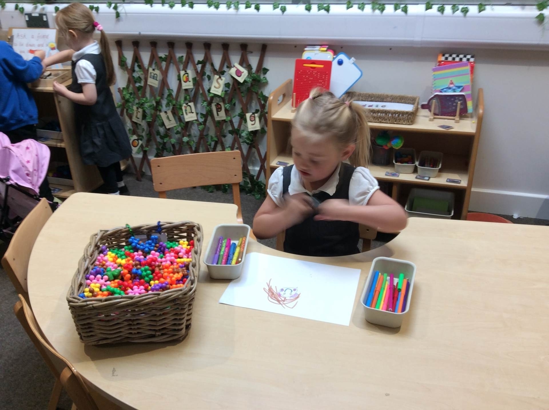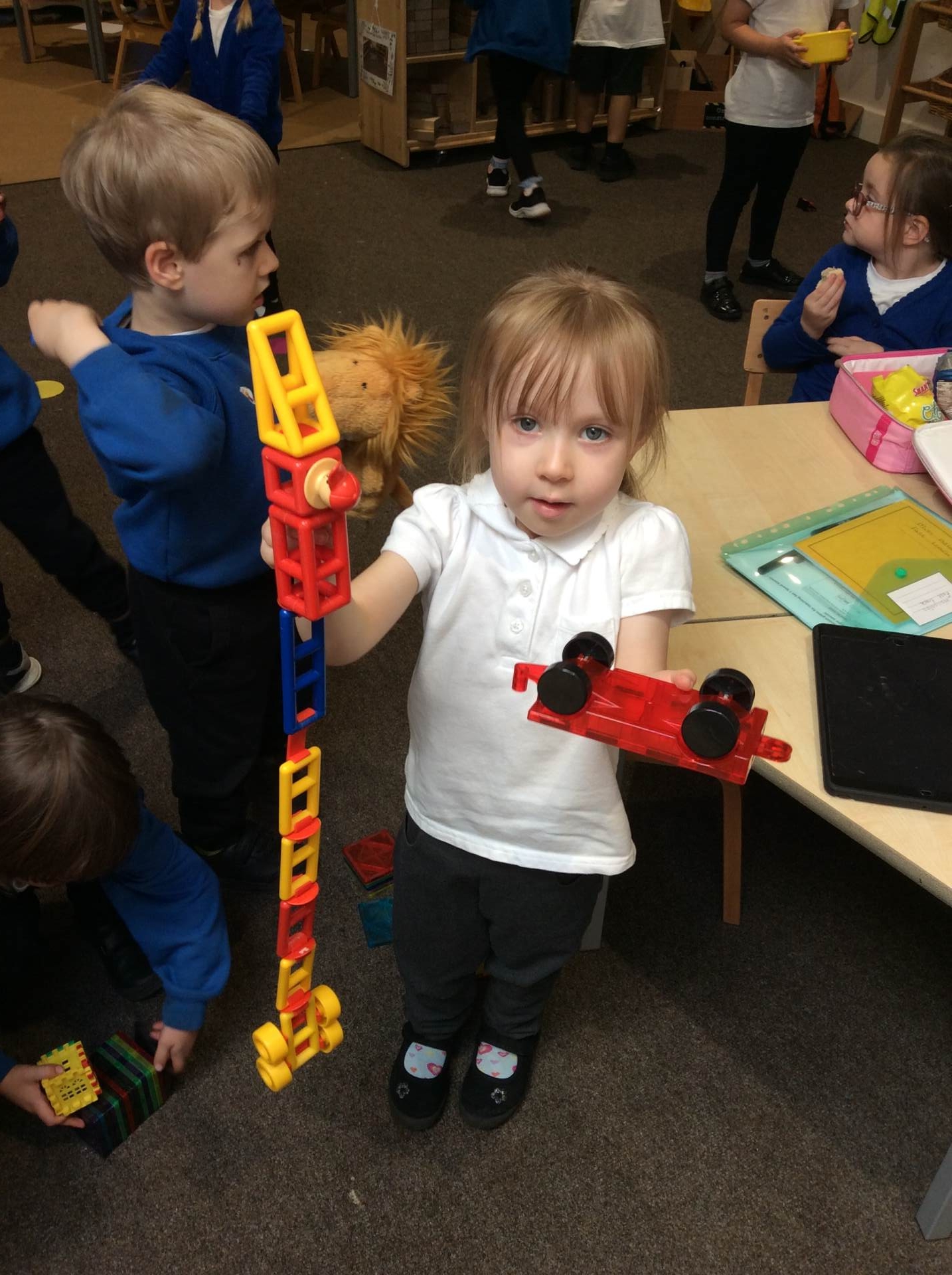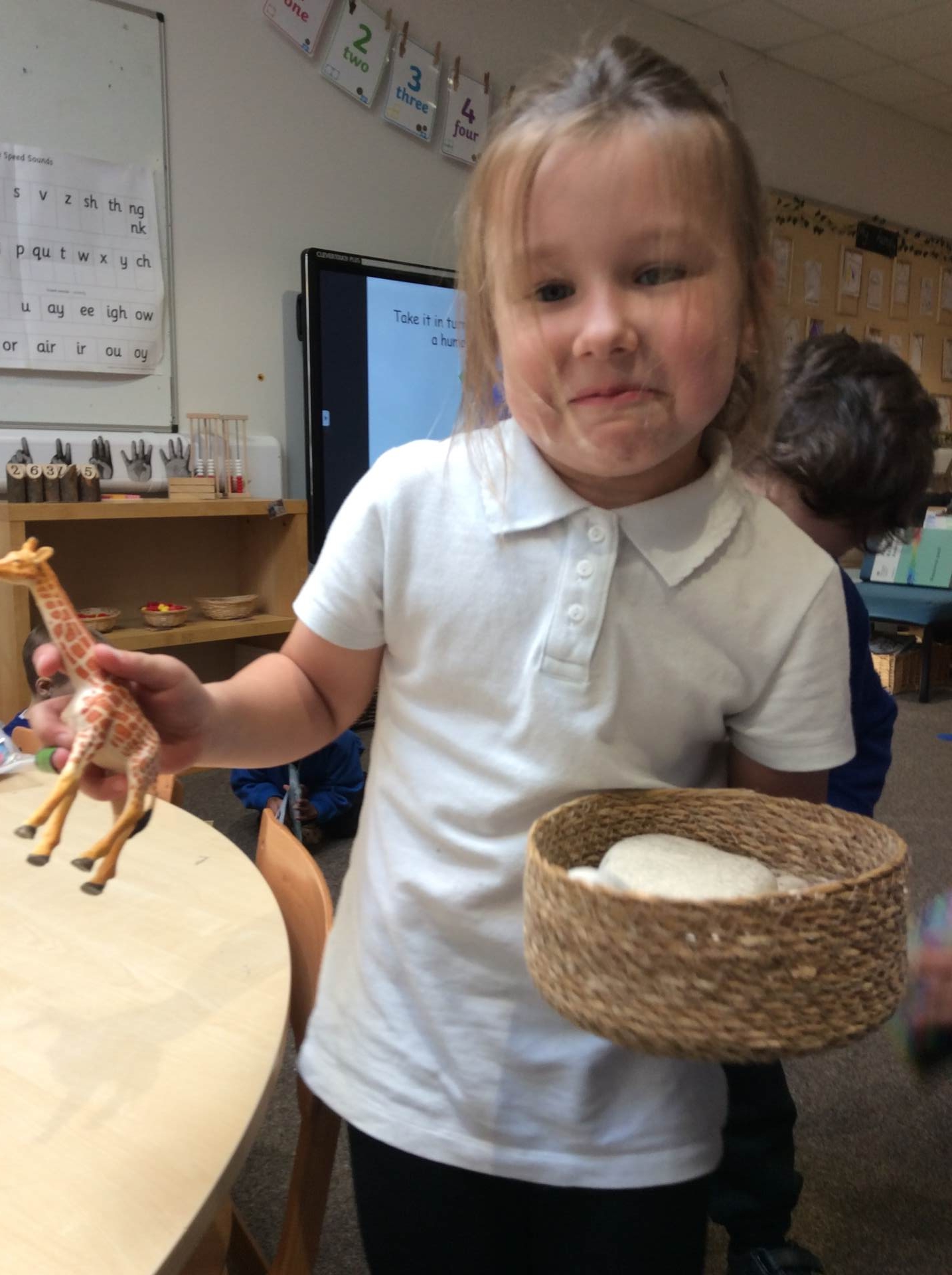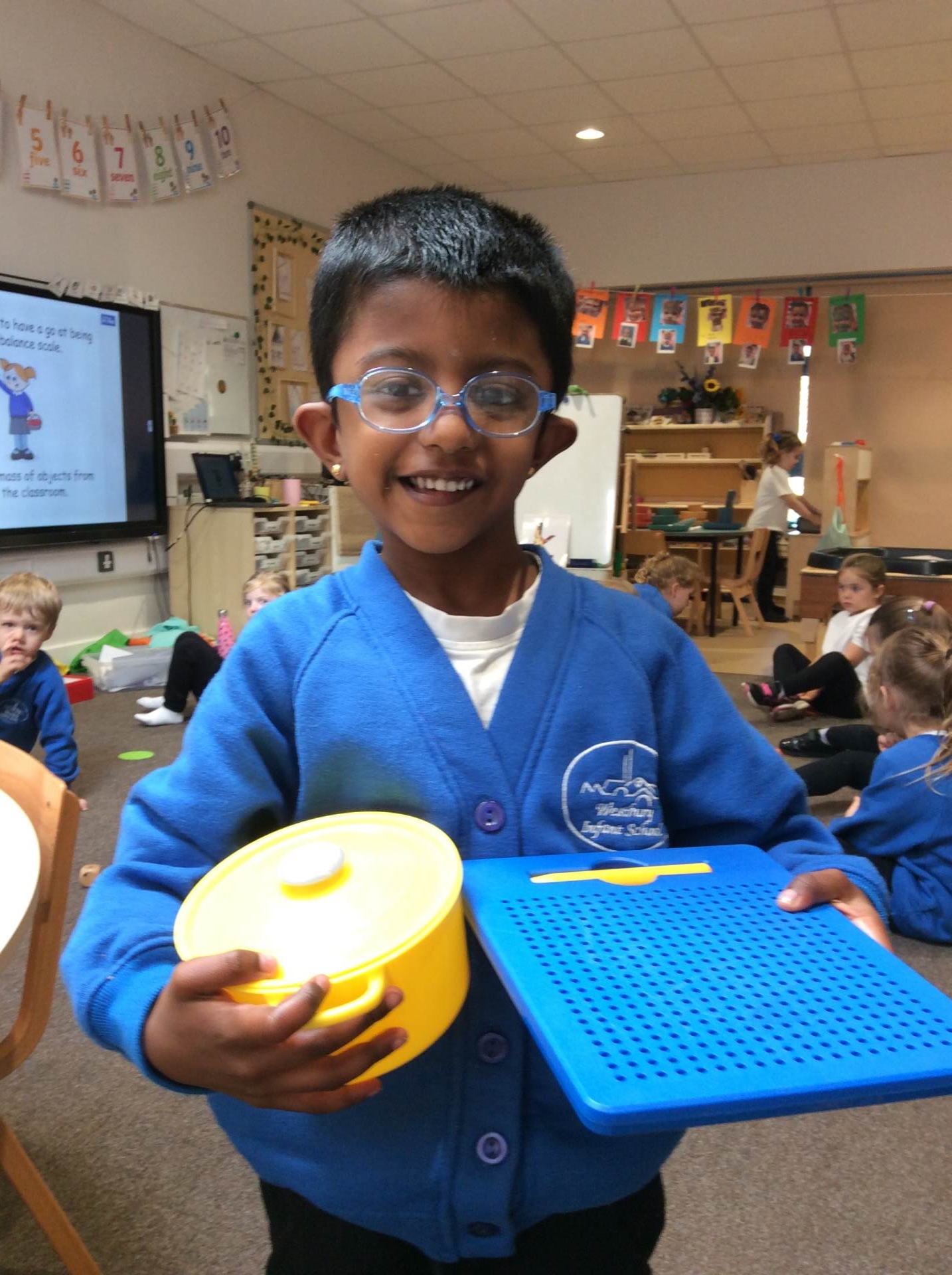 This week for squiggle whilst you wiggle we practised ‘the hump’ which will help when forming letters such as m, n, h, and r. We did this to the song ‘m bop’ by Hanson which was so much fun! In maths our focus has been comparing size and mass of different objects around the classroom. We chose objects and placed them into a big hoop or a small hoop depending on their size. This led us in to comparing the weight of different objects and discussing which one is lighter / heavier. We read the story ‘Dear Zoo’ in one of our maths lessons and tried to guess what animal might be in each box, depending on its size. We then looked at a mystery box and predicted what might be inside before thinking about what else we could fit into it.