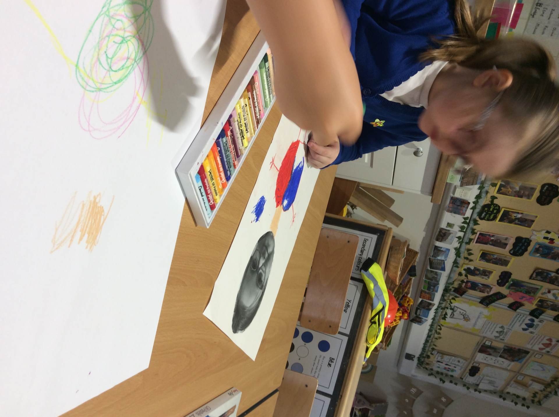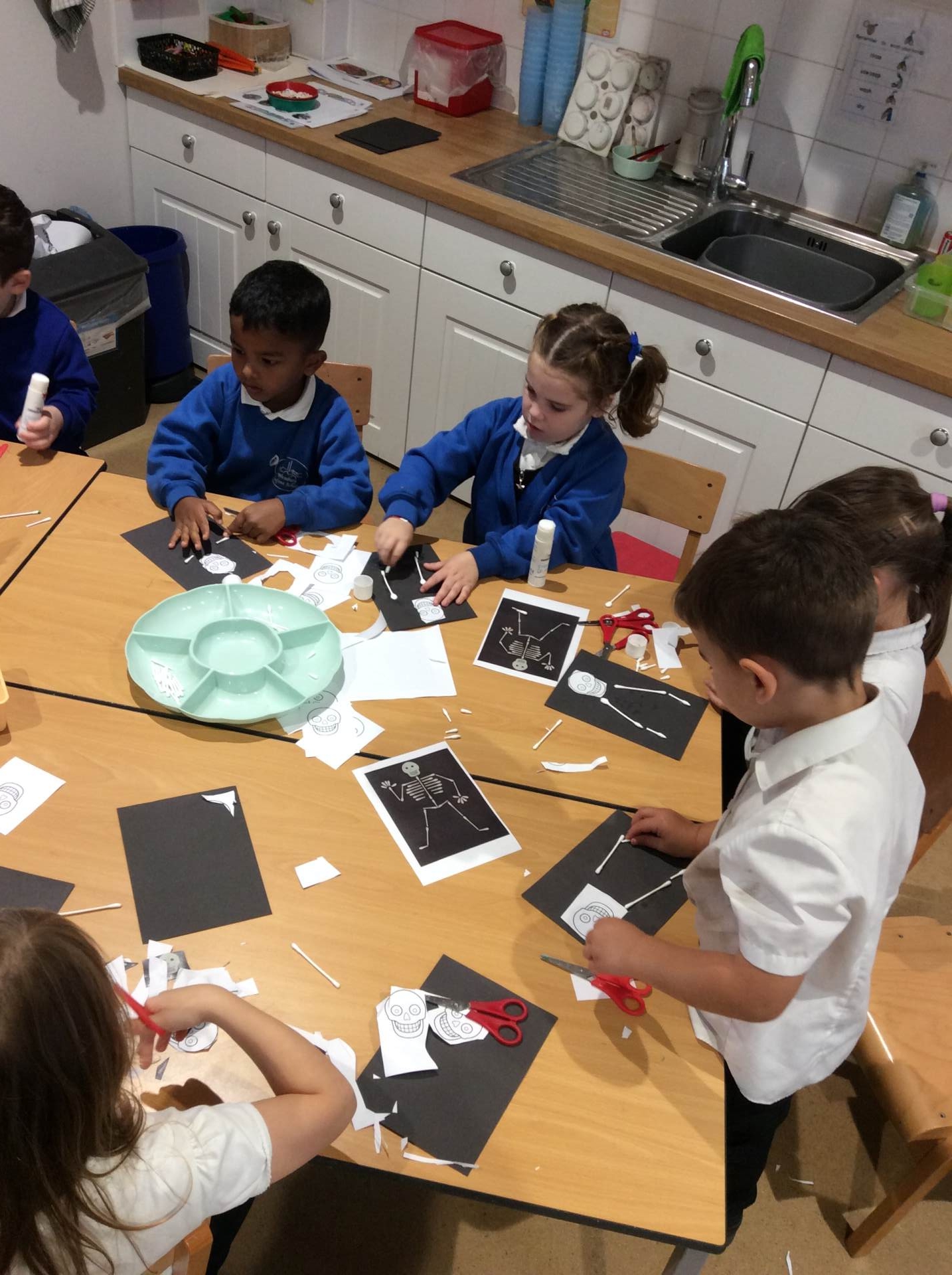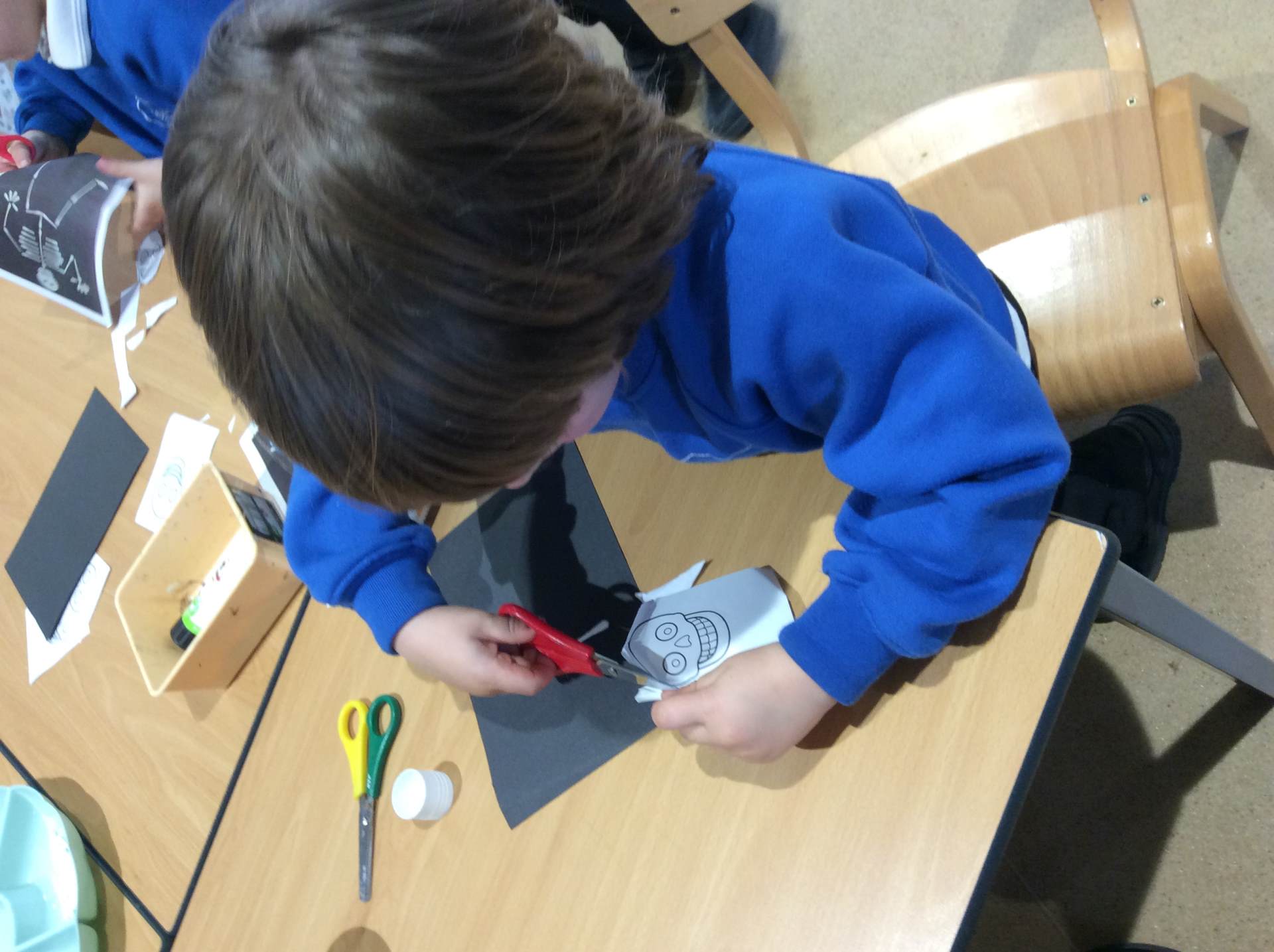 This week our theme has been our body and keeping healthy. We have enjoyed singing songs such as head, shoulders, knees and toes and naming different body parts and a skeleton song called ‘Dem bones’. This led into us making skeleton pictures using cotton buds and black paper. We also enjoyed listening to the story ‘Funny bones’ and talking to our partners about what we would do if we were skeletons! Lots of children enjoyed drawing around their bodies on the floor with chalk or on large sheets of paper and naming / labelling the different body parts. We thought about and talked as a class about what we need to do to be healthy and to live a healthy lifestyle. There were lots of great ideas!