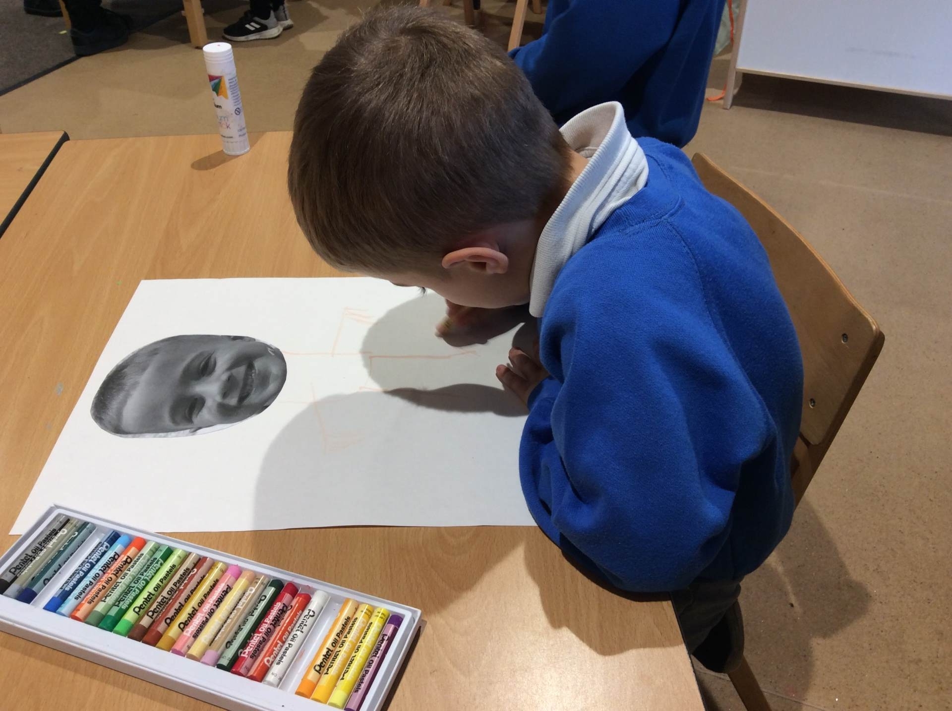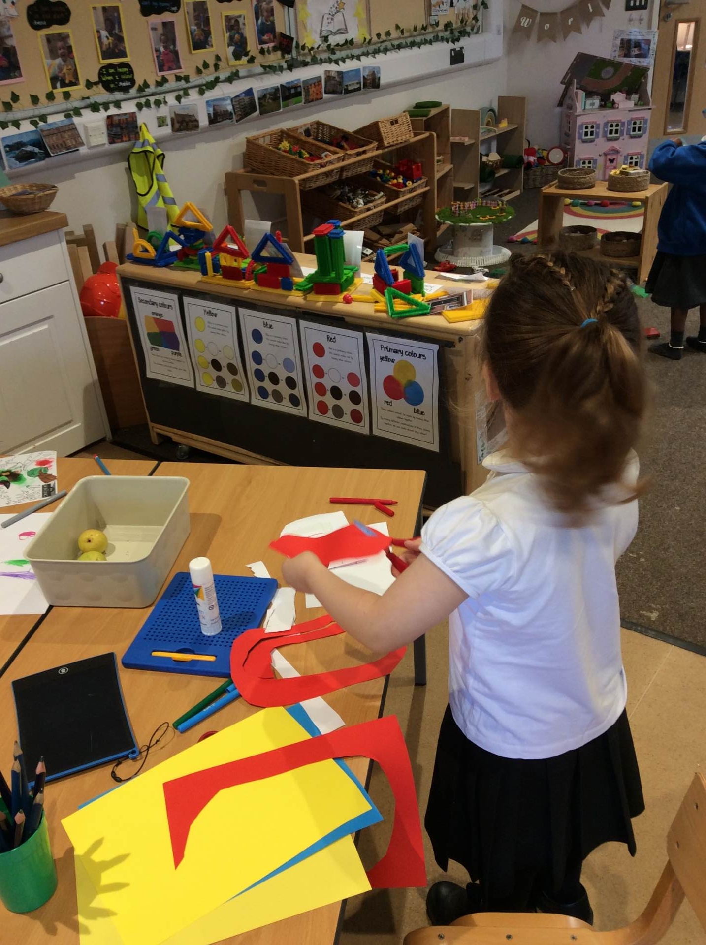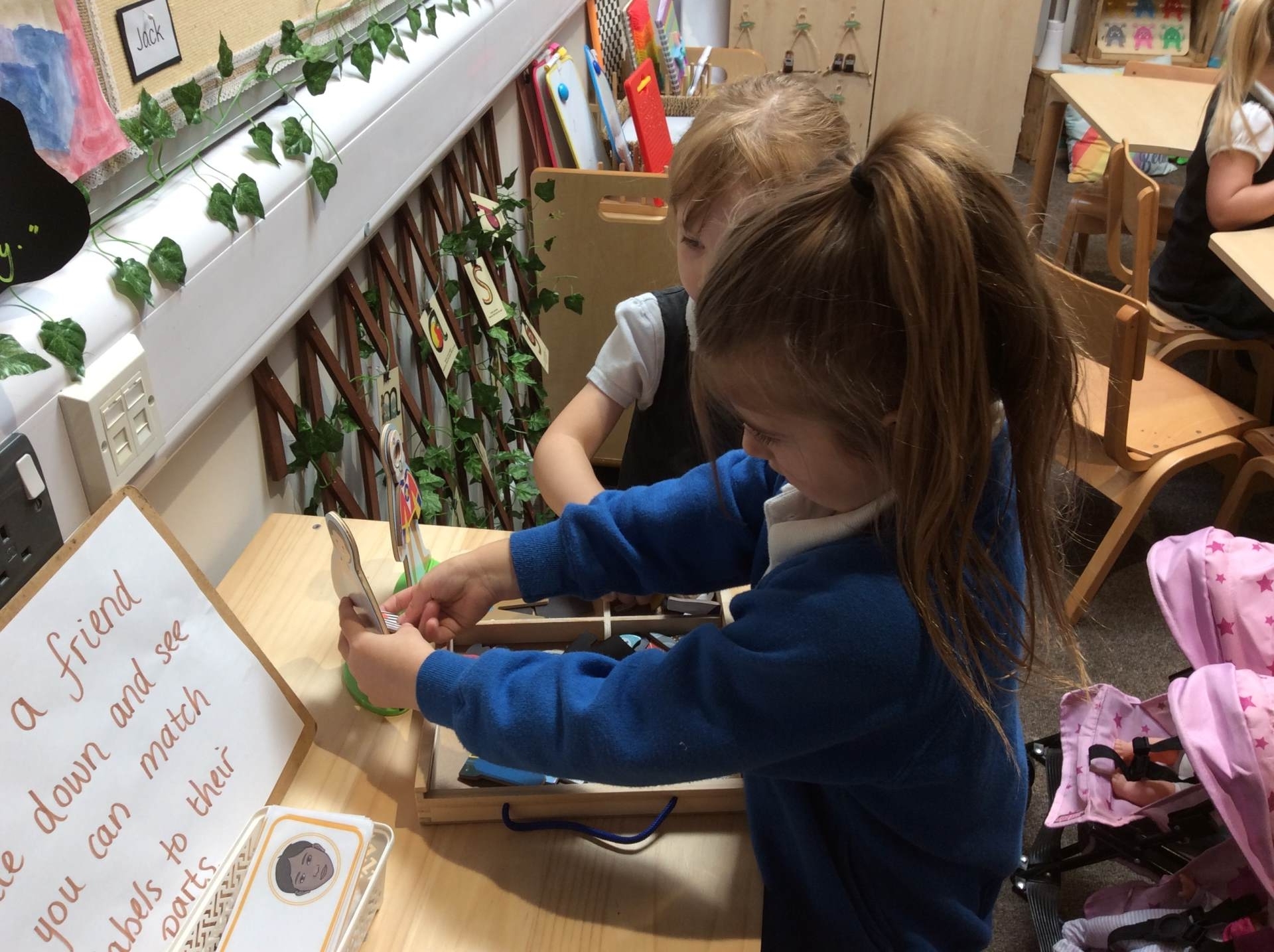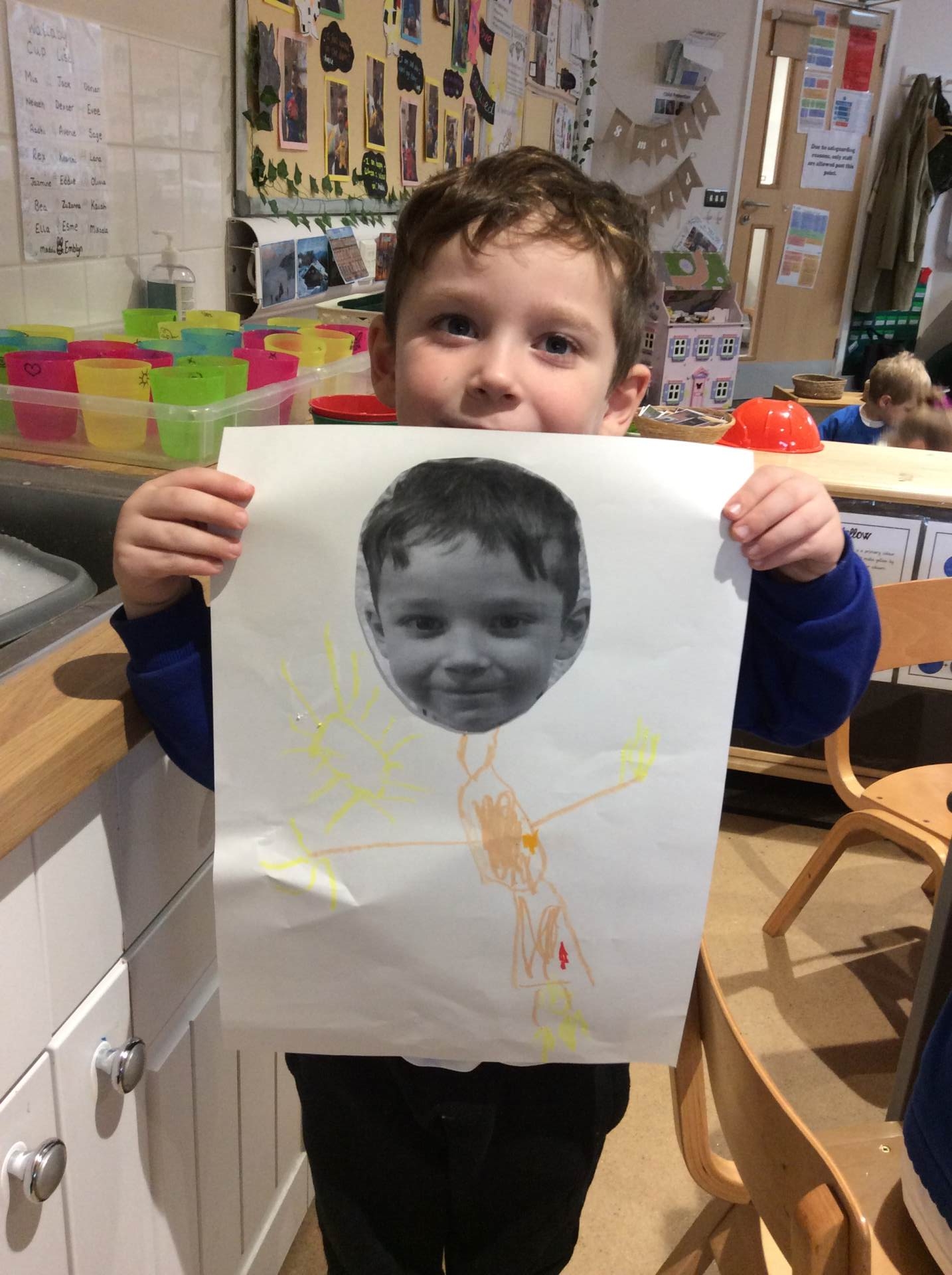 This week our theme has been our body and keeping healthy. We have enjoyed singing songs such as head, shoulders, knees and toes and naming different body parts and a skeleton song called ‘Dem bones’. This led into us making skeleton pictures using cotton buds and black paper. We also enjoyed listening to the story ‘Funny bones’ and talking to our partners about what we would do if we were skeletons! Lots of children enjoyed drawing around their bodies on the floor with chalk or on large sheets of paper and naming / labelling the different body parts. We thought about and talked as a class about what we need to do to be healthy and to live a healthy lifestyle. There were lots of great ideas!