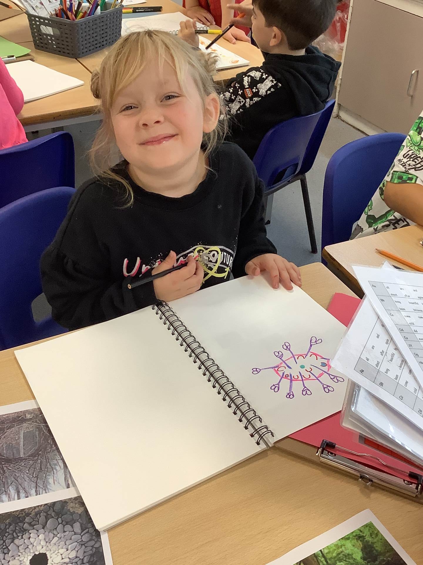 We were looking at the story 'Lila and the Secret of the Rain' in drawing club this week. The children describe Lila and a Kenyan village, before thinking about what animals might come out when it rains and how the village might celebrate when the rain finally comes.