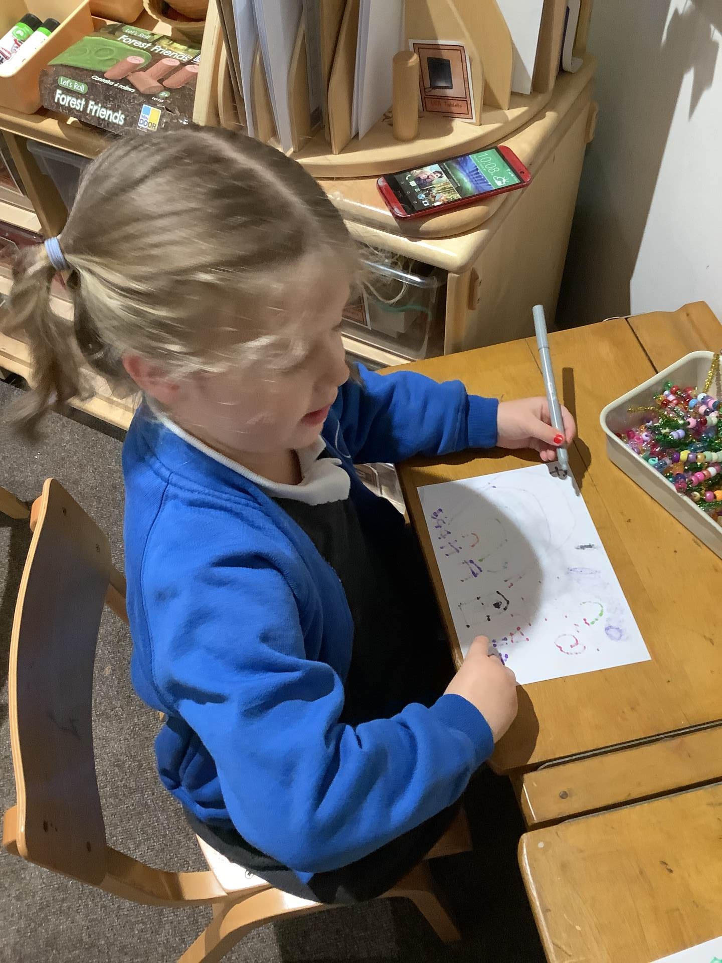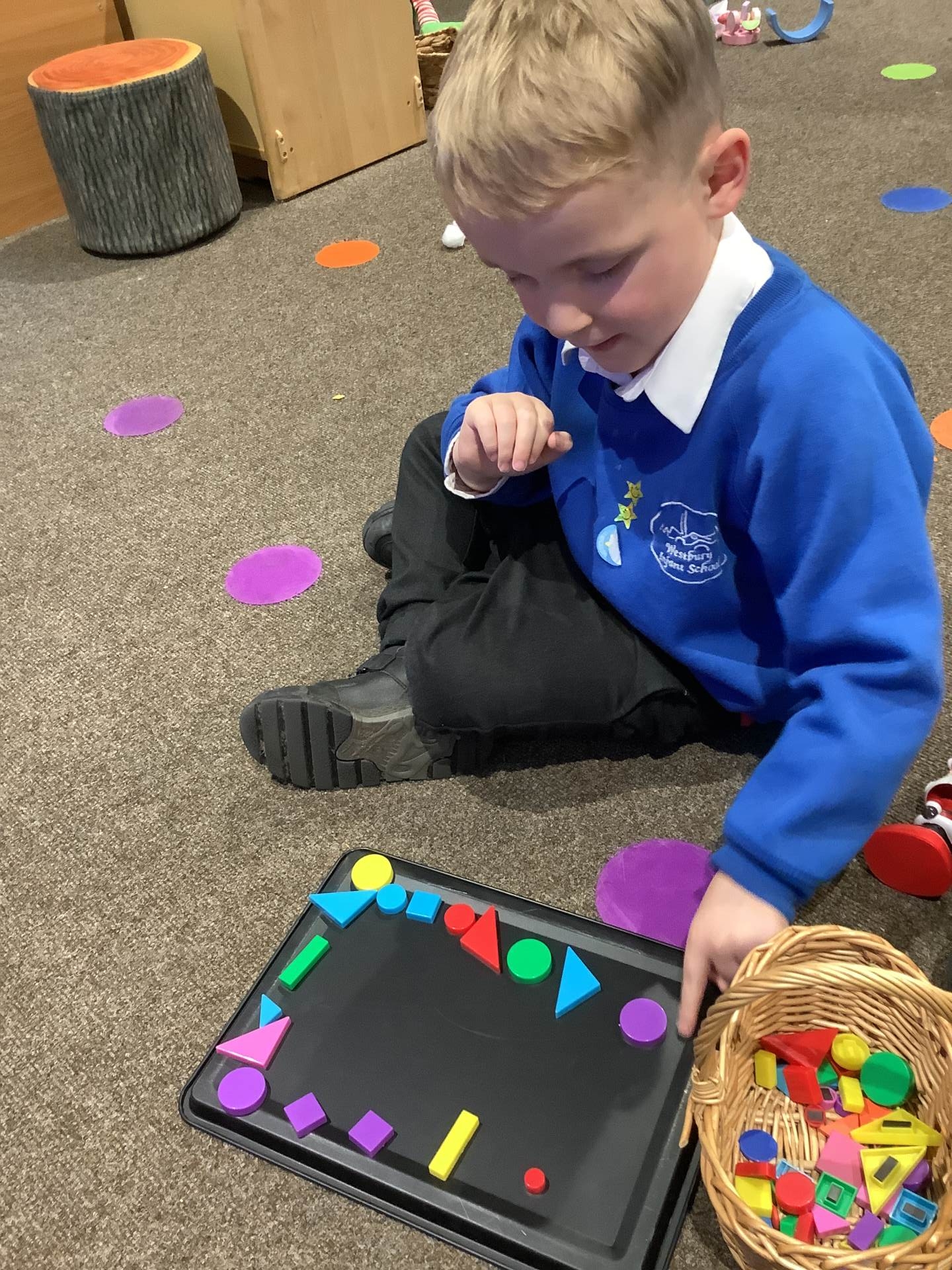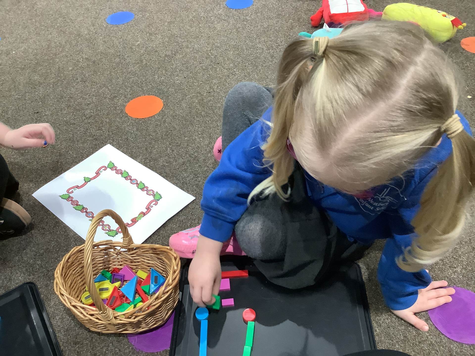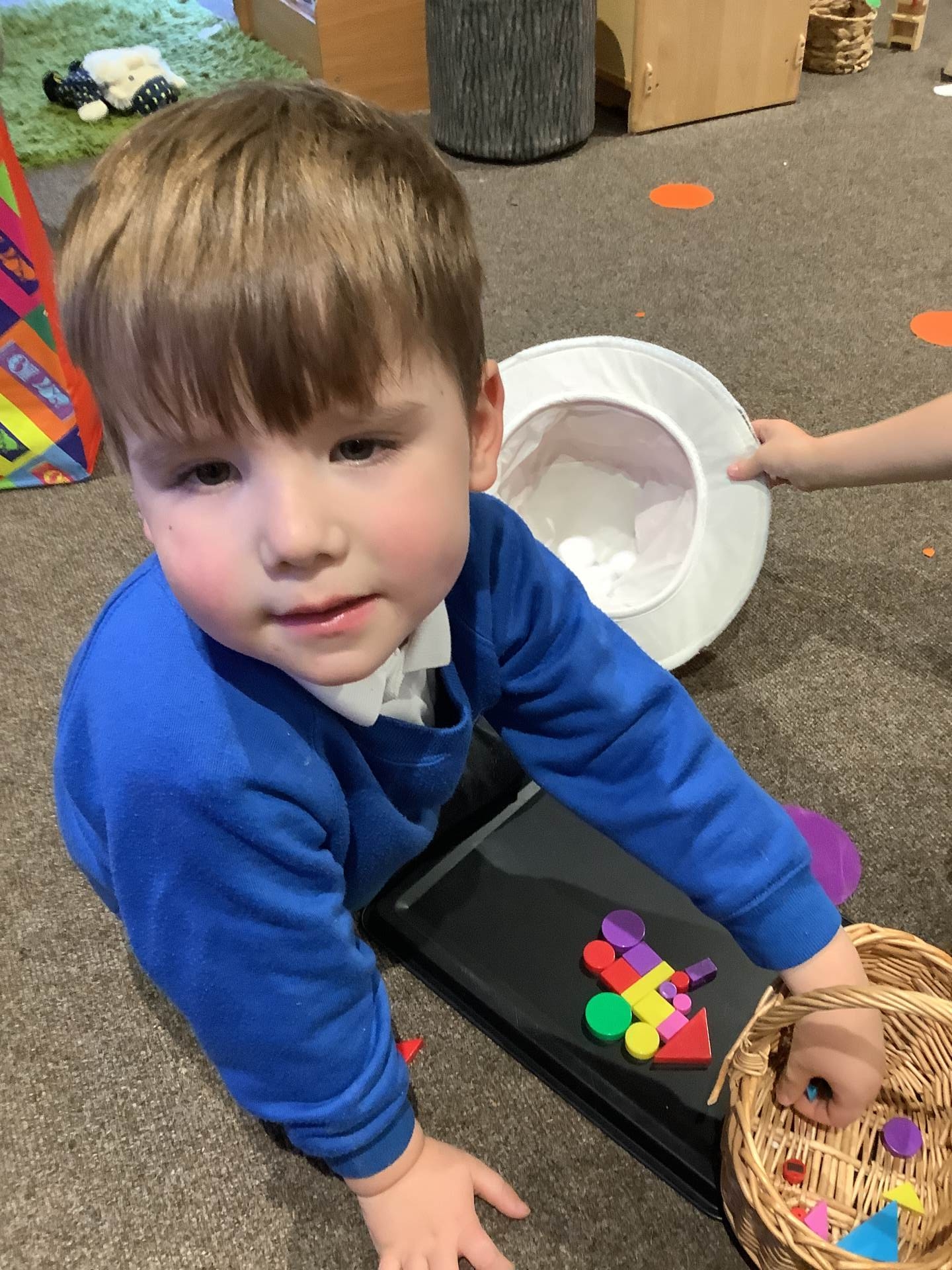 The children have also been learning about four-sided shapes. They enjoyed being shape detectives and searching for rectangles in our environment. They took part in a sorting activity, grouping shapes into those with four sides and those without, and learned that a square is a special type of rectangle because its sides are all the same length. When the children were confident with the shapes they then had the opportunity to use these in their play to create a shape picture. The children then explored how shapes fit together and were excited to discover that two triangles can make a square. At the end of the week, we learned about day and night and talked about the different things that happen at each time of day. The children shared their ideas about daily routines, such as getting ready for school in the morning and going to bed at night.