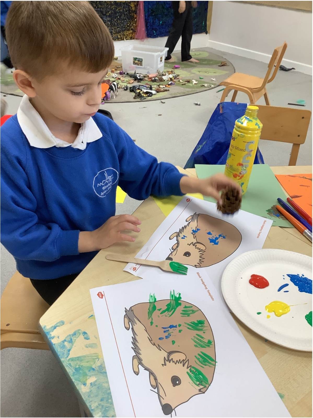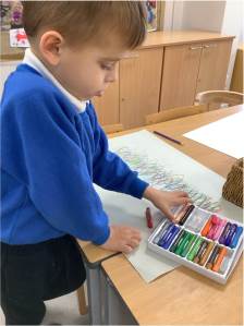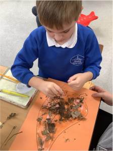 We’ve also continued to develop our fine motor skills through a range of creative activities. The children crunched, scrunched, and ripped different papers and leaves to add texture to their artwork, making fantastic hedgehog pictures. They experimented with printing patterns in playdough using natural materials and carefully painted pinecones, practising precision and control with their paintbrushes.